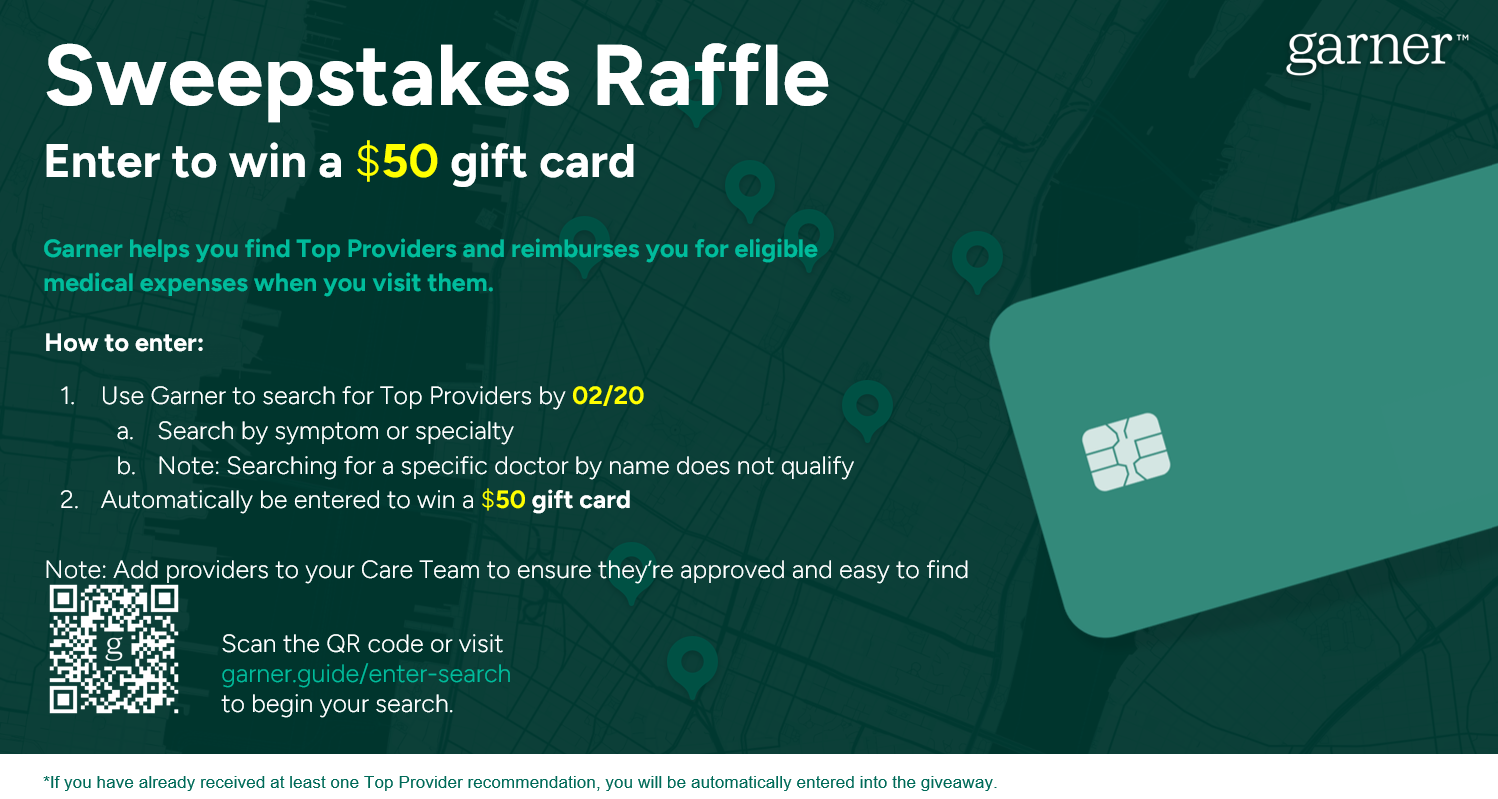 Entry Period 1/1/2026 — 2/20/2026. Eligible only to those who (i) are, as of the date of entry, 18 years of age or older or the age of majority in their state of residence (19 in Alabama, Nebraska, 21 in Mississippi, and 18 in all other states), (ii) are enrolled in Sponsor’s HDHP, Value PPO, PPO, J1 Visa Plan (iii) are current employees of Versiti, (iv) have created a Garner Health account and performed at least one (1) Search using the search function in the Garner app or on the Garner website prior to 2/20/2026, and (v) are legal residents of the United States. Void where prohibited. Contact KPatterson@versiti.org to see Official Rules for full details. NO PURCHASE NECESSARY.
